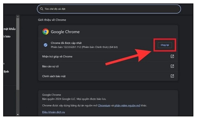Sau khi quá trình thực hiện đã hoàn tất những thao tác trên, bạn chỉ cần click vào nút Chạy lại như hình bên dưới để bắt đầu khởi chạy lại trình duyệt với cái phiên bản mới nhé.
