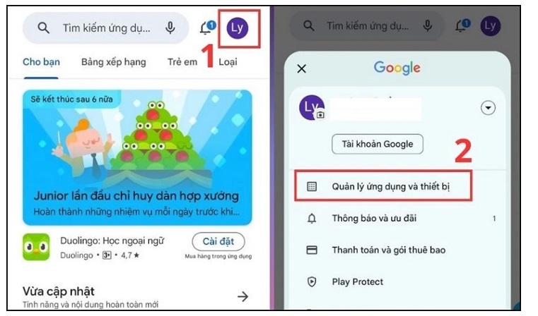 Bước 1: Bạn bấm vào cửa hàng CH Play trên điện thoại. Sau đó, bạn thực hiện bấm vào biểu tượng Hồ sơ như hình bên dưới. Rồi bạn nhấn chọn vào mục Quản lý ứng dụng và thiết bị.