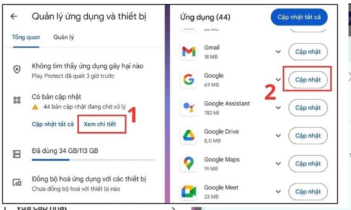 Bước 2: Ở tại giao diện mới được hiển thị, bạn thực hiện việc nhấn vào nút Xem chi tiết nằm ở bên dưới mục Có bản cập nhật. Lúc này, bạn chỉ cần thực hiện việc tìm kiếm và nhấn vào nút Cập nhật nằm ở ngay bên cạnh Google Chrome.