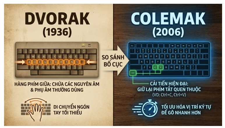 - Về bố cục Colemak (2006): đây được xem như là bản cải tiến hiện đại. Chính Colemak đã giữ nguyên được vị trí của hầu hết các phím tắt có tính quen thuộc (như là Ctrl+C, Ctrl+V) nhưng tối ưu lại là vị trí các chữ cái để thực hiện gõ nhanh hơn.