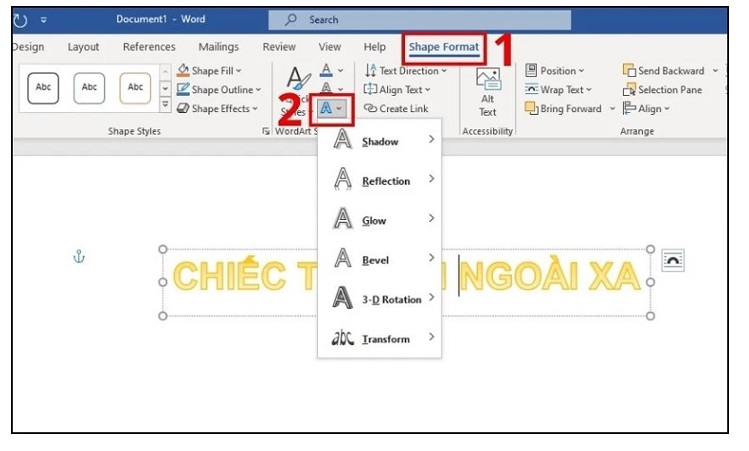 Bước 3: Tiếp theo, bạn hãy lần lượt thực hiện chọn thẻ Shape Format. Bạn chọn mục Text Effects như hình bên dưới đây: