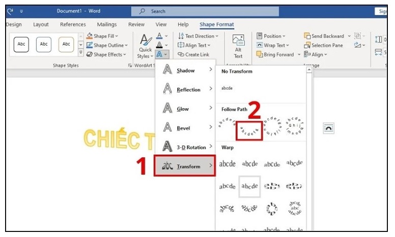 Bước 4: Cuối cùng, bạn chỉ cần chọn vào kiểu Transform để có thể tạo chữ cong ở trong Word.