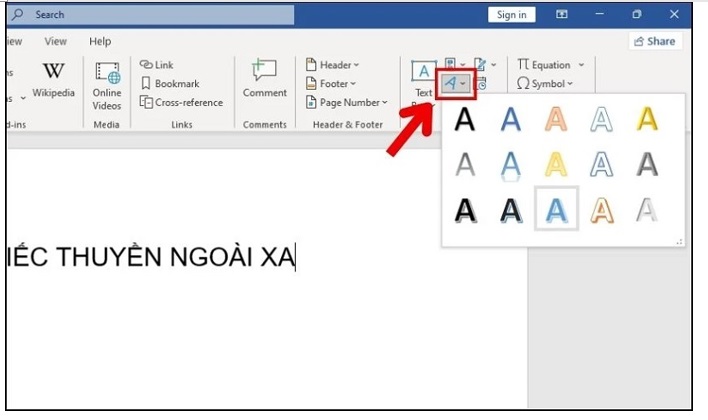 Bước 2: Sau đó thì bạn nhấn chọn vào thẻ Insert. Bạn hãy chọn vào công cụ WordArt rồi tham khảo. Và bạn nhấn chọn mẫu mà bạn cần áp dụng.