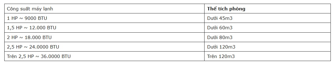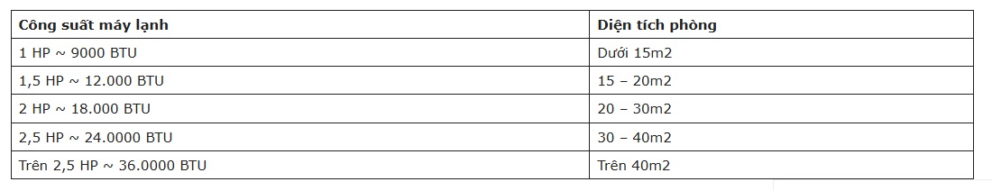 Bên cạnh việc bạn dựa vào diện tích phòng để lựa chọn công suất máy lạnh hiệu quả thì bạn cũng có thể tham khảo bảng thông số thông dụng ngay dưới đây: