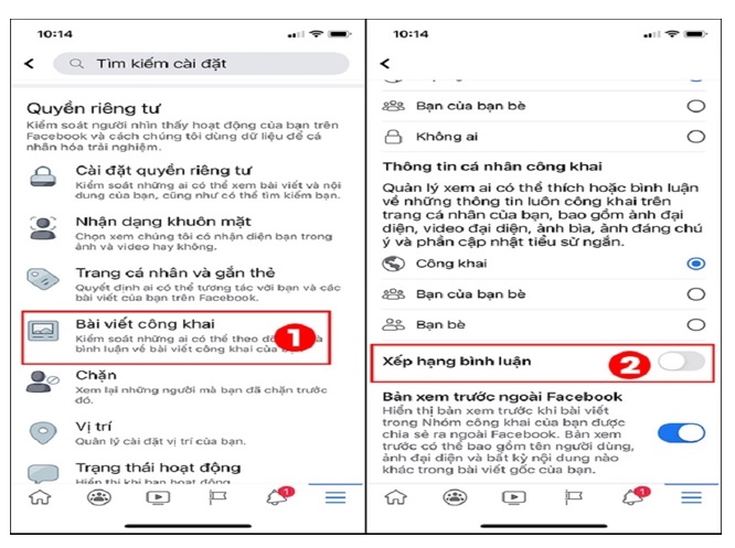 Bước 2: Tiếp theo, bạn thực hiện việc cuộn màn hình xuống phần Quyền riêng tư. Và click chọn vào mục Bài viết công khai. Ngay sau đó, bạn sẽ nhìn thấy được tính năng Xếp hạng bình luận được hiển thị. Bạn chỉ cần thực hiện việc kéo thanh trượt bên cạnh sang phải để kích hoạt tính năng này thành công!