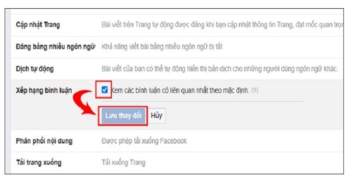 Bước 4: Lúc này, các tính năng quản lý trang sẽ được hiển thị ở bên dưới phần Chung. Bạn hãy nhấp vào mục Chỉnh sửa nằm ở bên cạnh của phần Xếp hạng bình luận. Cuối cùng, bạn đánh dấu tích vào mục Xem các bình luận mà có liên quan nhất theo như mặc định và nhấp nút Lưu thay đổi để hoàn tất.