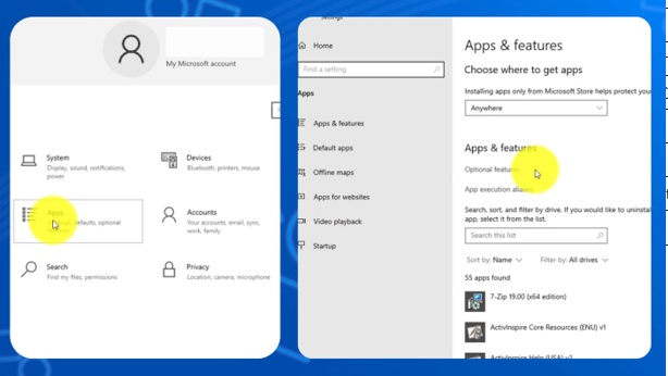 Bạn bấm mở Settings. Bấm chọn Apps. Bấm chọn Optional Features.
