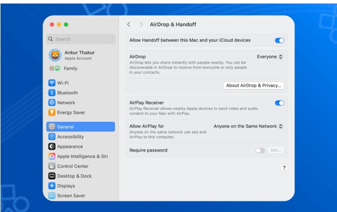 Bạn thực hiện mở System Settings. Bấm chọn General. Bấm chọn AirDrop & Handoff và thực hiện việc kích hoạt tùy chọn AirPlay Receiver.