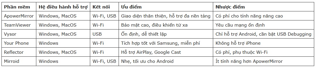 Nhiều phần mềm hỗ trợ cho bạn chiếu màn hình điện thoại lên trên máy tính với tính năng đa dạng. Bên dưới đây là bảng phần mềm được chúng tôi tổng hợp: