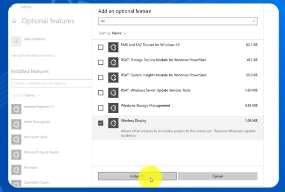 Bạn bấm chọn Add a feature. Bạn thực hiện tìm Wireless Display. Sau đó bạn bấm vào chọn Install để cài đặt.