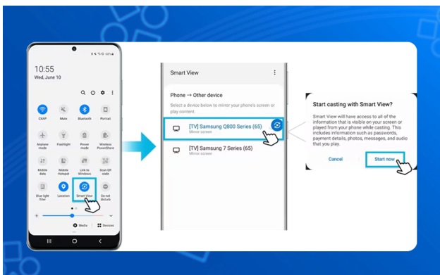 Ở trên điện thoại thì bạn vào Cài đặt hiển thị (Display Settings) hay là Công cụ nhanh (Quick Settings). Bạn bấm chọn Screen Mirroring, Smart View, hay là Cast (tùy theo hãng máy).
