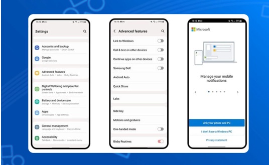 Bạn thực hiện mở Cài đặt. Bạn chọn Tính năng nâng cao (Advanced Features). Bạn chọn Link your phone and PC.