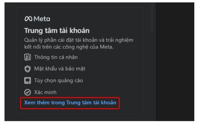 • Bước 2: Ở tại khung phía bên trái thì bạn sẽ thấy được mục Trung tâm tài khoản. Bạn hãy nhấn vào mục Xem thêm trong Trung tâm tài khoản.