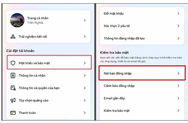 • Bước 1: Bạn hãy nhấn vào chọn mục Mật khẩu và bảo mật. Sau đó thì bạn nhấp vào Nơi bạn đăng nhập.