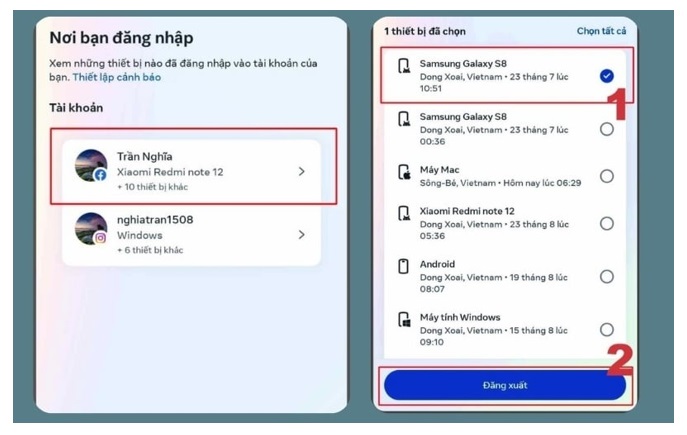 • Bước 4: Bạn hãy lựa chọn tài khoản muốn đăng xuất. Rồi bấm chọn vào các thiết bị nghi ngờ hay là nhấn Chọn tất cả rồi xác nhận việc thoát ra tài khoản.