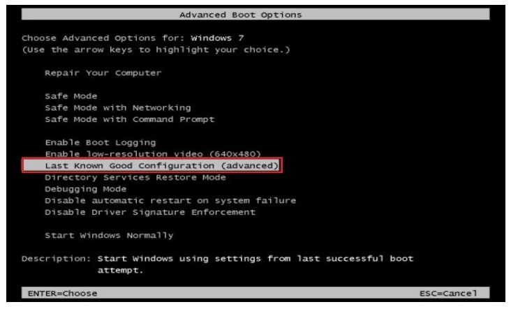 Bước 3: Tiếp theo thì bạn sử dụng những phím mũi tên lên xuống ở trên bàn phím. Để nhấn chọn vào mục Last Known Good Configuration (advanced). Cuối cùng thì bạn chỉ cần nhấp vào phím Enter trên bàn phím để máy tính được khởi động lại.