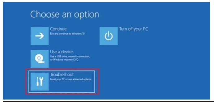 Bước 1: Bạn hãy nhấp giữ đồng thời vào phím Shift và nút Restart. Ngay sau đó thì giao diện Choose an option sẽ được hiển thị ra trên màn hình máy tính. Bạn lần lượt thực hiện nhấn chọn vào mục Troubleshoot. Bạn nhấn chọn Advanced options để tiếp tục.
