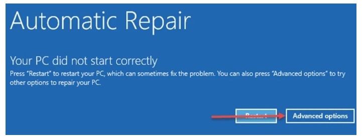 Bước 3: Bạn hãy đợi cho đến lúc mà hệ điều hành Windows kiểm tra. Và chuẩn đoán được xem lỗi đang xảy ra ở trên thiết bị là gì. Sau đó, ở trên màn hình sẽ được hiển thị giao diện Automatic Repair. Bạn hãy thực hiện việc nhấn vào nút Advanced options như hình bên dưới: