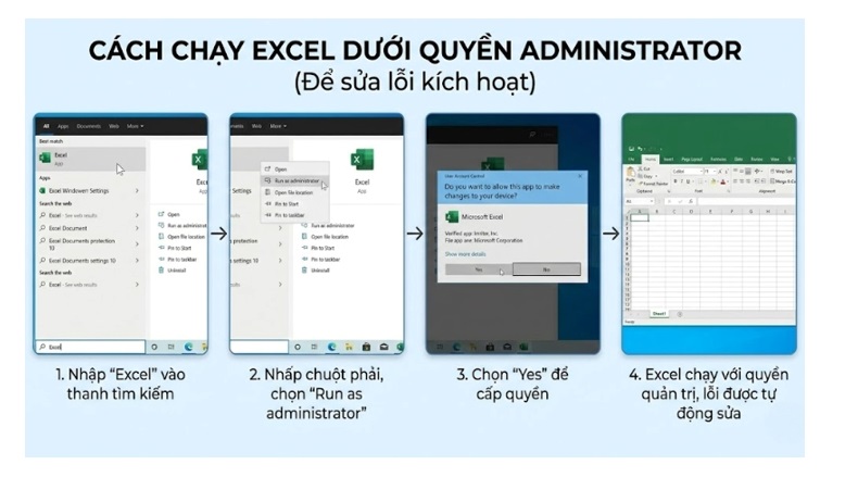Cấp quyền quản trị giúp cho Excel sẽ tự động sửa được các file kích hoạt bị lỗi.