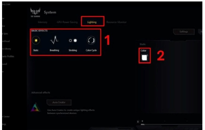 Bước 4: Bạn thực hiện việc chọn mục Lighting. Ở tại đây bạn sẽ nhìn thấy rất nhiều chế độ ánh sáng như Static, Breathing và cả Color Cycle,… Bạn hãy lưu ý rằng không phải hiệu ứng nào cũng sẽ có thể cho phép tùy chỉnh màu sắc.