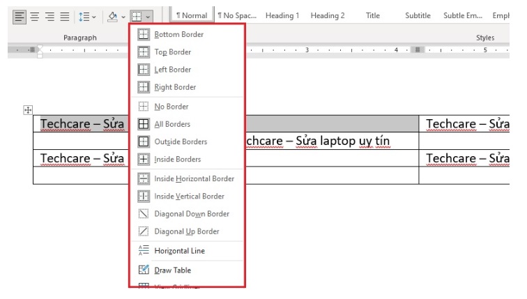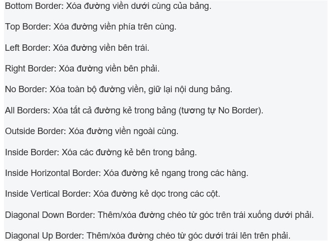 Ở trong menu Borders thì bạn lựa chọn tùy chọn phù hợp. Ví dụ là No Border để có thể xóa toàn bộ đường viền hay là Bottom Border để xóa đường viền dưới.