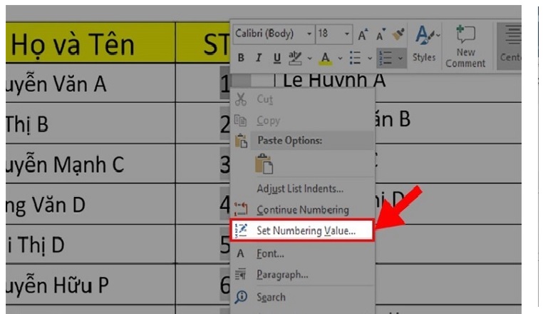 Bước 3: Cho đến khi đánh số thứ tự ở trong word được hoàn tất. Thì bạn chỉ cần nhấn chuột trái vào số thứ tự bạn đã được đánh ở tại cột bôi đen trước đó. Bạn nhấn chuột phải và chọn vào Set Numbering Value.