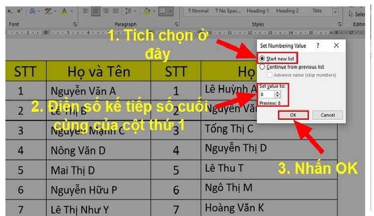 Bước 4: Khi hộp thoại mới được xuất hiện thì bạn nhấn chọn vào mục Start new list. Ở tại mục Set value to thì bạn hãy thực hiện việc thiết lập số thứ tự bạn muốn đánh tiếp theo. Rồi bạn nhấn OK để hoàn tất.