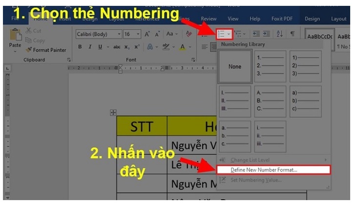 Bước 2: Sau đó, bạn lần lượt thực hiện việc chọn vào Numbering. Và bạn nhấn vào tùy chọn Define New Numbering Format.