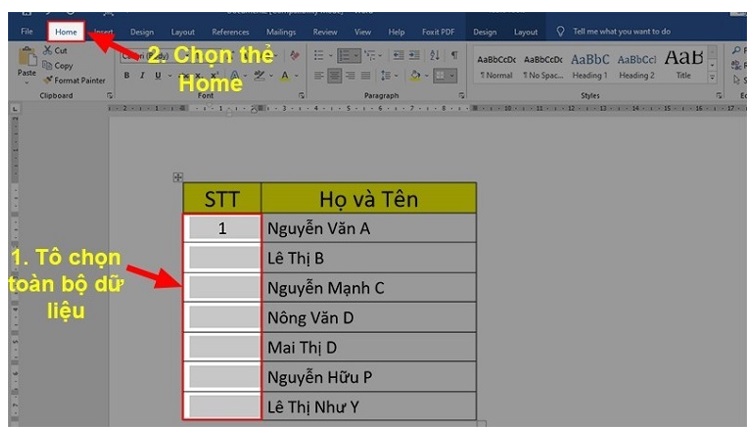 Bước 5: Sau đó, bạn hãy thực hiện tô chọn tất cả dữ liệu mà bạn muốn đánh số thứ tự. Bạn nhấn chọn Home để tiếp tục.