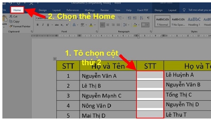 Bước 1: Đầu tiên, bạn nhấp mở file word chứa bảng mà bạn muốn đánh số thứ tự. Rồi bạn di chuyển trỏ chuột đến ô bạn cần đánh số. Sau đó thì bạn nhấn vào thẻ Home để tiếp tục.