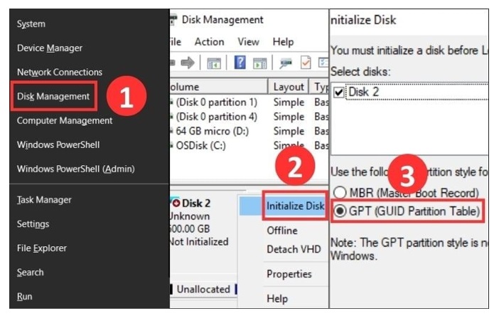 • Bước 2: Hệ thống lúc này sẽ tự động hiện ra bảng Initialize Disk. Bạn thực hiện tick vào chọn ổ cứng mới. Tiếp đến bạn chọn chuẩn GPT, rồi nhấn vào OK.