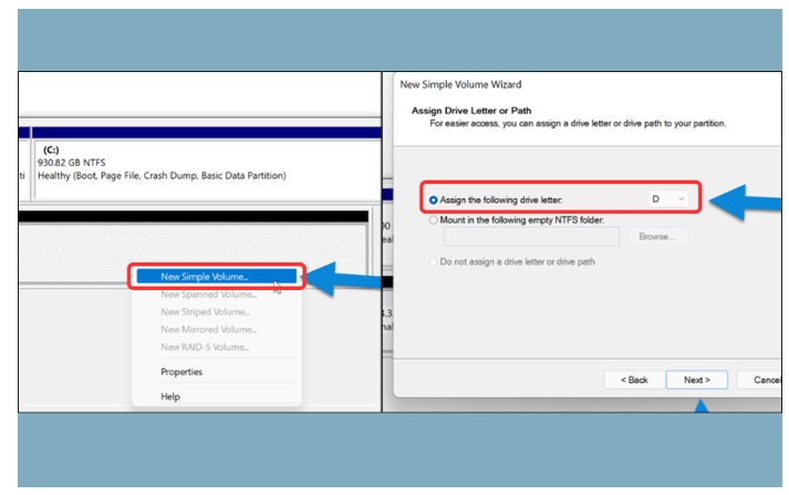 • Bước 5: Ở tại mục Assign the following drive letter thì bạn chọn một ký tự bất kỳ danh cho ổ đĩa. Và tiếp đến nhấn Next.