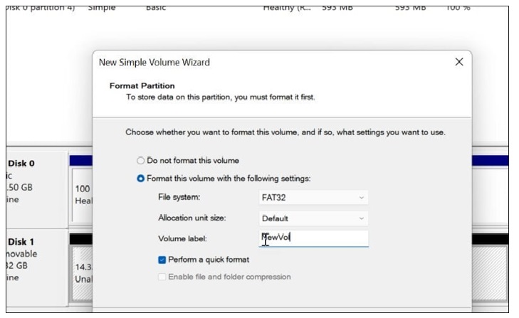 • Bước 4: Thực hiện việc nhấn Next liên tiếp ở những cửa sổ để thực hiện đồng ý với mức dung lượng ở mức tối đa mà hệ thống sẽ đề xuất cho phân vùng.