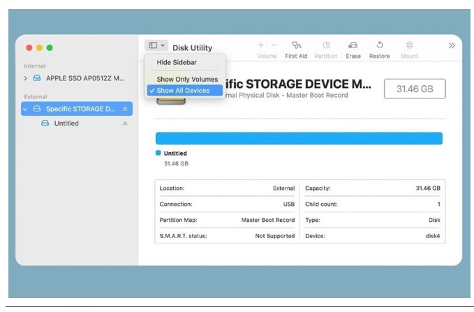 • Bước 3: Bạn hãy nhìn sang cột bên trái của giao diện thì bạn hãy chọn ra đúng tên ổ cứng SSD mới vừa được thực hiện kết nối vào máy Mac.