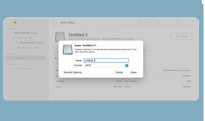 • Bước 5: Hãy điền tên ổ đĩa mới thì bạn thực hiện chọn Format là APFS. Và bạn nhấn vào Erase để thực hiện việc  xác nhận và chờ hệ thống hoàn tất của quá trình mà định dạng.