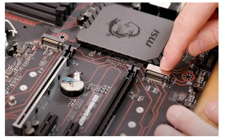 • b là Kiểm tra chân cắm M.2: Đối với chuẩn kết nối NVMe thì bạn hãy tháo ốc ra. Rồi sau đó rút ổ cứng ra và thực hiện cắm lại chặt chẽ vào khe M.2 ở trên của bo mạch chủ.