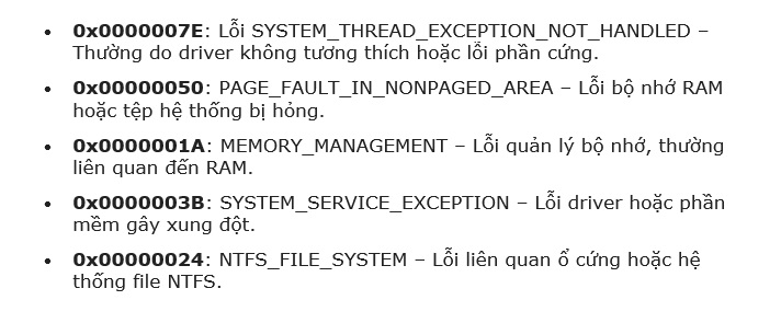 Bên dưới đây là một số mã gây ra lỗi màn hình xanh phổ biến cùng ý nghĩa và cách xử lý chúng: