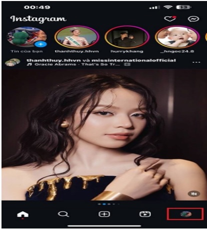 Bước 1: Bạn truy cập vào tài khoản Instagram trên điện thoại của bạn. Bạn chọn vào biểu tượng trang cá nhân ở phía dưới góc phải màn hình.