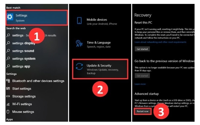 - Bước 1: Bạn bấm vào chọn Settings trong thanh tìm kiếm Windows. Rồi bấm vào chọn Update & Security. Ở trong mục Recovery thì người dùng bấm chọn Restart now ở mục Advanced Startup.