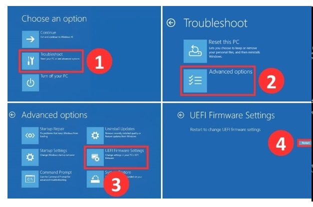 - Bước 2: Ở menu BIOS thì người dùng bấm vào chọn Troubleshoot. Rồi bấm vào chọn Advanced options. Bạn nhấn vào chọn tiếp mục UEFI Firmware Settings. Rồi nhấn tiếp vào Restart.