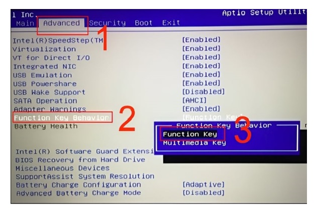 - Bước 3: Ở menu sẽ hiện ra thì người dùng lúc này sẽ chọn chuyển qua tab Advanced. Rồi bấm vào chọn Function Key Behavior. Sau đó thì hãy nhấn Function Key.