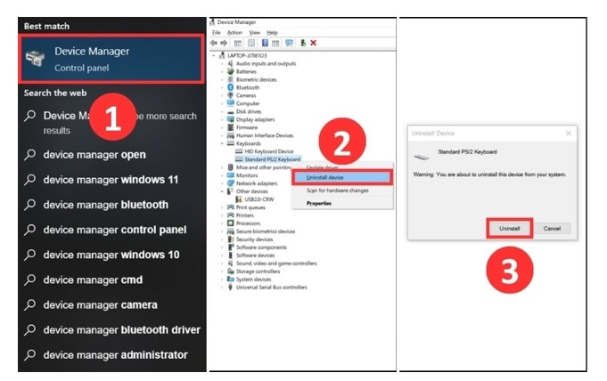 - Bước 2: Bạn bấm vào mũi tên nhỏ ở bên trái của mục Keyboards. Rồi nhấn vào chuột phải vào ở dòng Standard PS/2 Keyboard. Bạn hãy bấm chọn lệnh Uninstall device để thực hiện gỡ cài đặt.