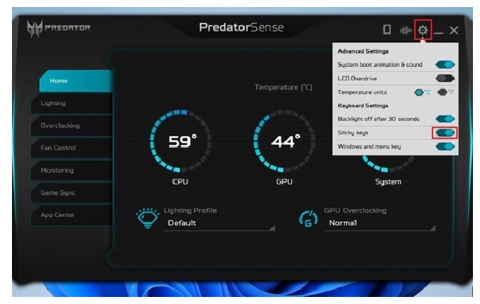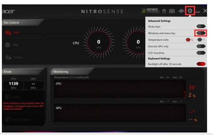 Những dòng Acer Nitro ProPanel đều được có thể tích hợp sẵn phần mềm NitroSense. Những Game thủ có thể vào ở mục cài đặt để thực hiện việc tắt phím Windows and menu key. Điều đó có thể giúp bạn loại bỏ được tình trạng vô tình bấm nhầm làm văng ứng dụng khi mà Game thủ đang tham gia trận game.