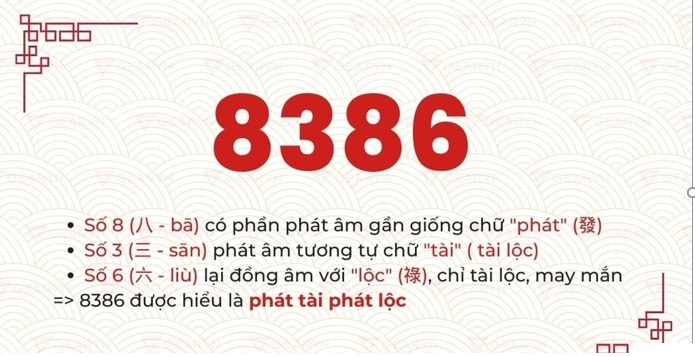 Ở trong tiếng Trung, số 8 (八 – bā) có phần phát âm gần giống như chữ “phát” (發) và mang ý nghĩa phát tài, phát đạt. Song song đó, số 3 (三 – sān) cũng phát âm tương tự chữ “tài” ( tài lộc). Số 6 (六 – liù) lại là đồng âm với “lộc” (祿), chỉ tài lộc và may mắn. Do đó cụm 8386 ghép lại thì có thể hiểu là “phát tài phát lộc” thể hiện cho những lời chúc thịnh vượng và những điều tốt lành sẽ đến.
