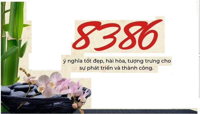 Ở trong thần số học, số 8 là đại diện cho sự thịnh vượng, phát triển và thành công ở trong sự nghiệp. Số 3 là biểu thị cho sự sáng tạo, trí tuệ và tài năng. Số 6 là tượng trưng cho sự hài hòa, cân bằng trong cuộc sống và sự may mắn. Dãy số 8386 được mang ý nghĩa kết hợp những phẩm chất tốt đẹp của ba con số này, đã hứa hẹn mang lại thành công, may mắn và sự cân bằng ở trong cuộc sống cho người sở hữu.