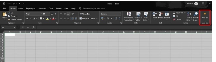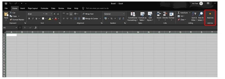 Bước 1: Bạn thực hiện việc mở chương trình Excel lên trên máy tính. Sau đó, bạn bắt đầu việc tìm kiếm và chọn vào công cụ Add-ins nằm ở vị trí góc ở trên phía bên phải màn hình.