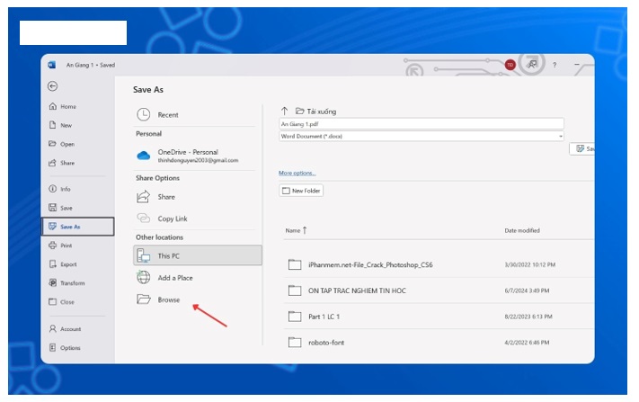 Bước 3: Sau đó bạn nhấp vào File tại góc trái phía trên cùng màn hình. Bạn nhấp vào Save as. Bạn nhấp vào Browse.