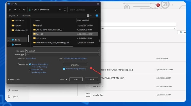 Bước 4: Lúc này bạn thực hiện việc chọn thư mục để lưu file. Ở mục Save as type thì bạn bấm chọn PDF. Rồi bạn nhấp vào Options.