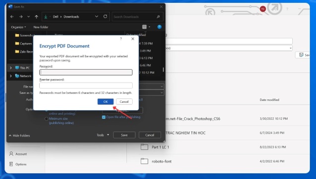 Bước 6: Sau đó bạn thực hiện việc nhập mật khẩu và xác nhận mật khẩu. Bạn nhấp chọn OK. Lúc này, khi bạn thực hiện mở file PDF, bạn sẽ được gửi yêu cầu là nhập mật khẩu.