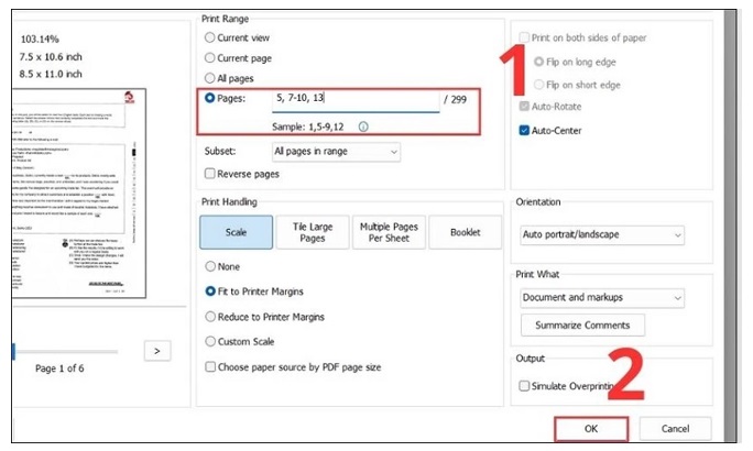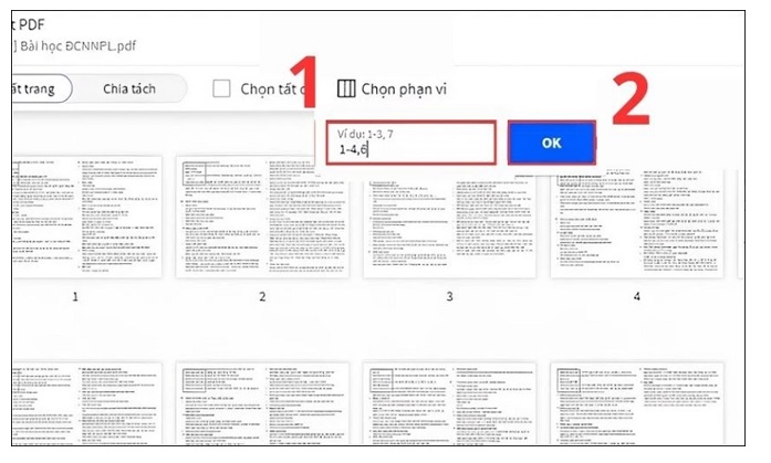 Bước 4: Ngay sau đó thì bạn sẽ được chuyển ngay đến cửa sổ thiết lập số trang có kèm theo khoảng cách mà muốn tách. Bạn hãy thực hiện nhập số trang mà bạn muốn tách. Và bạn nhấp vào nút Ok.